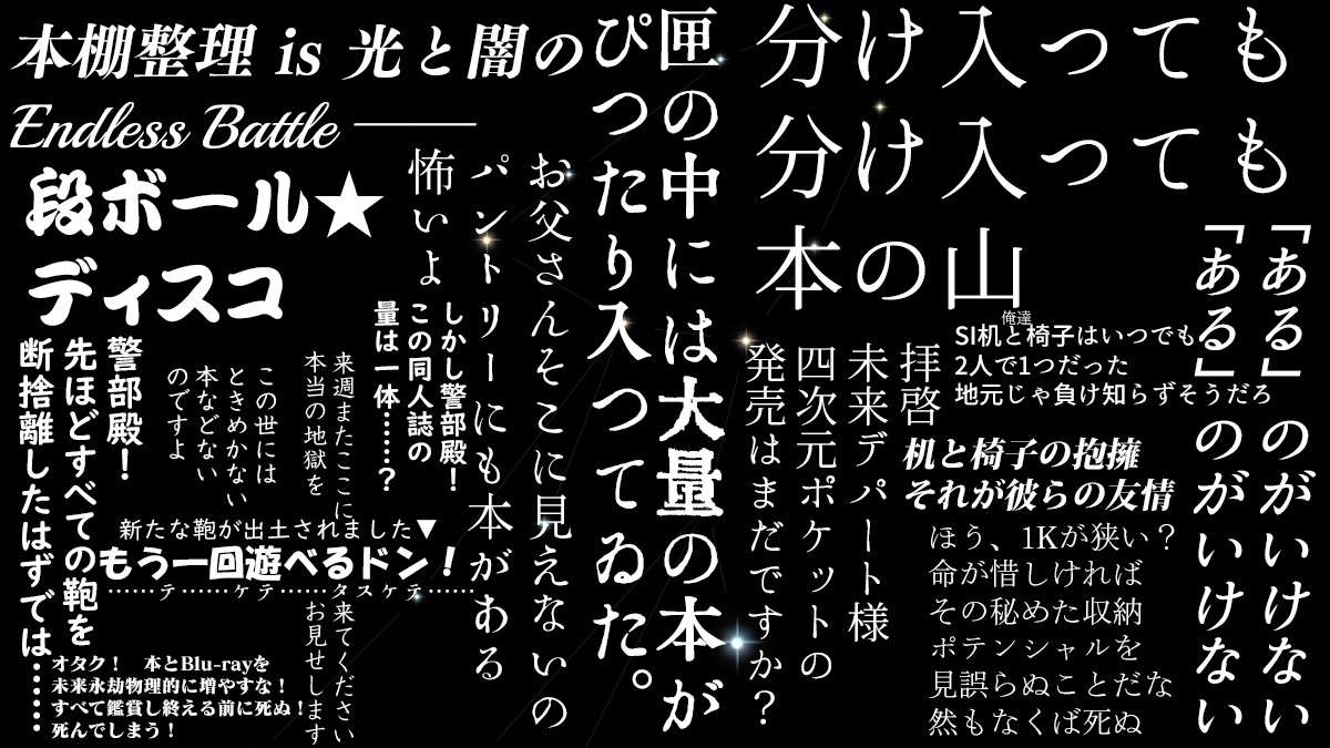 ……いや、あの、オタクはオタクでも私はグッズ収集しないタイプでして。だが、安心してください。代わりに蔵書数がえらいことになっているので本棚が高難易度ラスボスレベルでした。ときめかないものを手放すという片付けの心得あるそうですが、この世にはときめかねえ本なんてないんですよ!!!!!!!!(血涙)