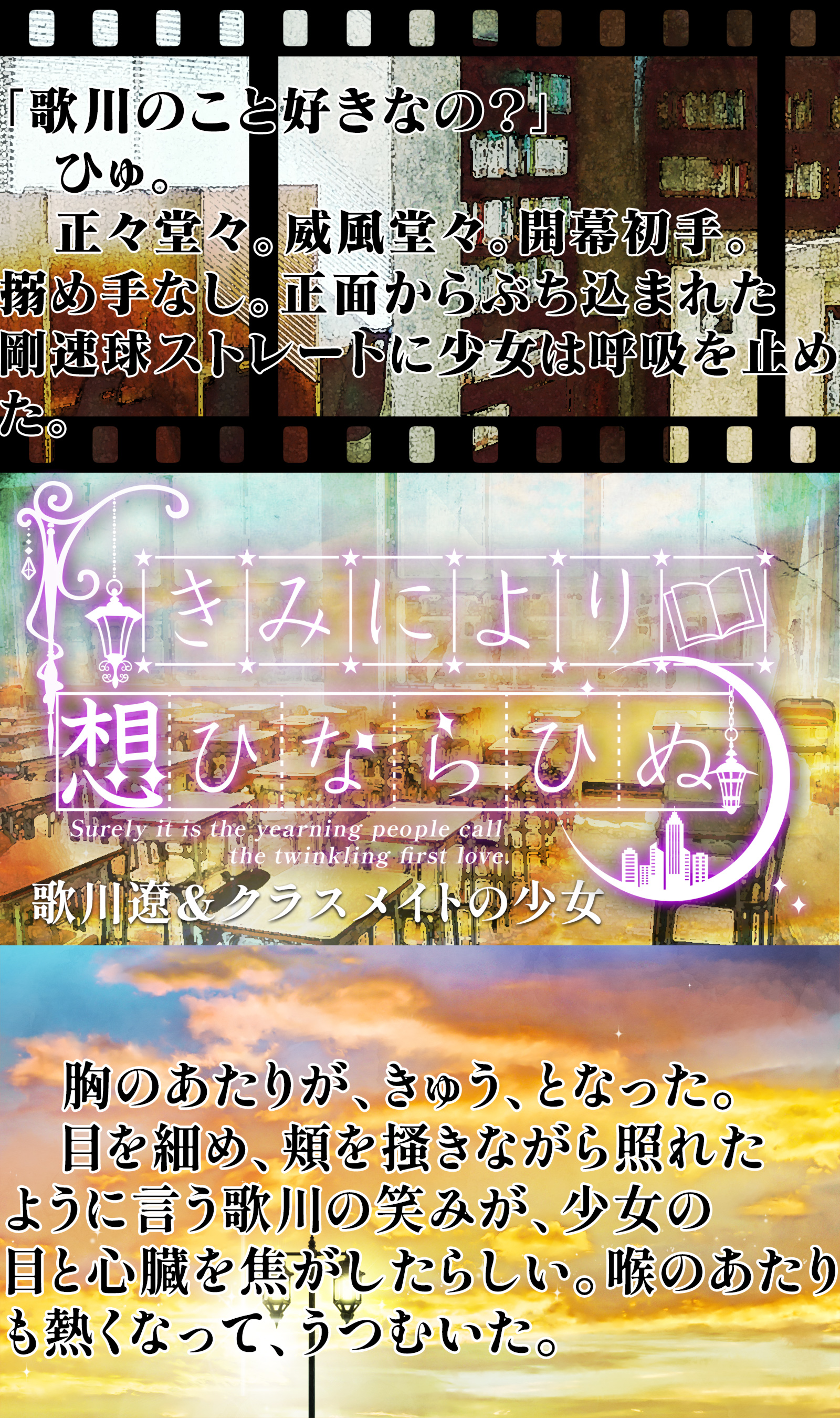 夢創作歴は年単位であるものの、恋愛が絡む物語は読み専門でした。自分には未来永劫書けないと思っていたジャンルの殻を破れたことに我ながら驚いています。けれど、歌川くんと彼に憧れ、彼の紫のばらのひとになりたいと願うクラスメイトのおんなのこにカメラを向けて追いかける時間はとても楽しく、とてもいとおしい時間でした。