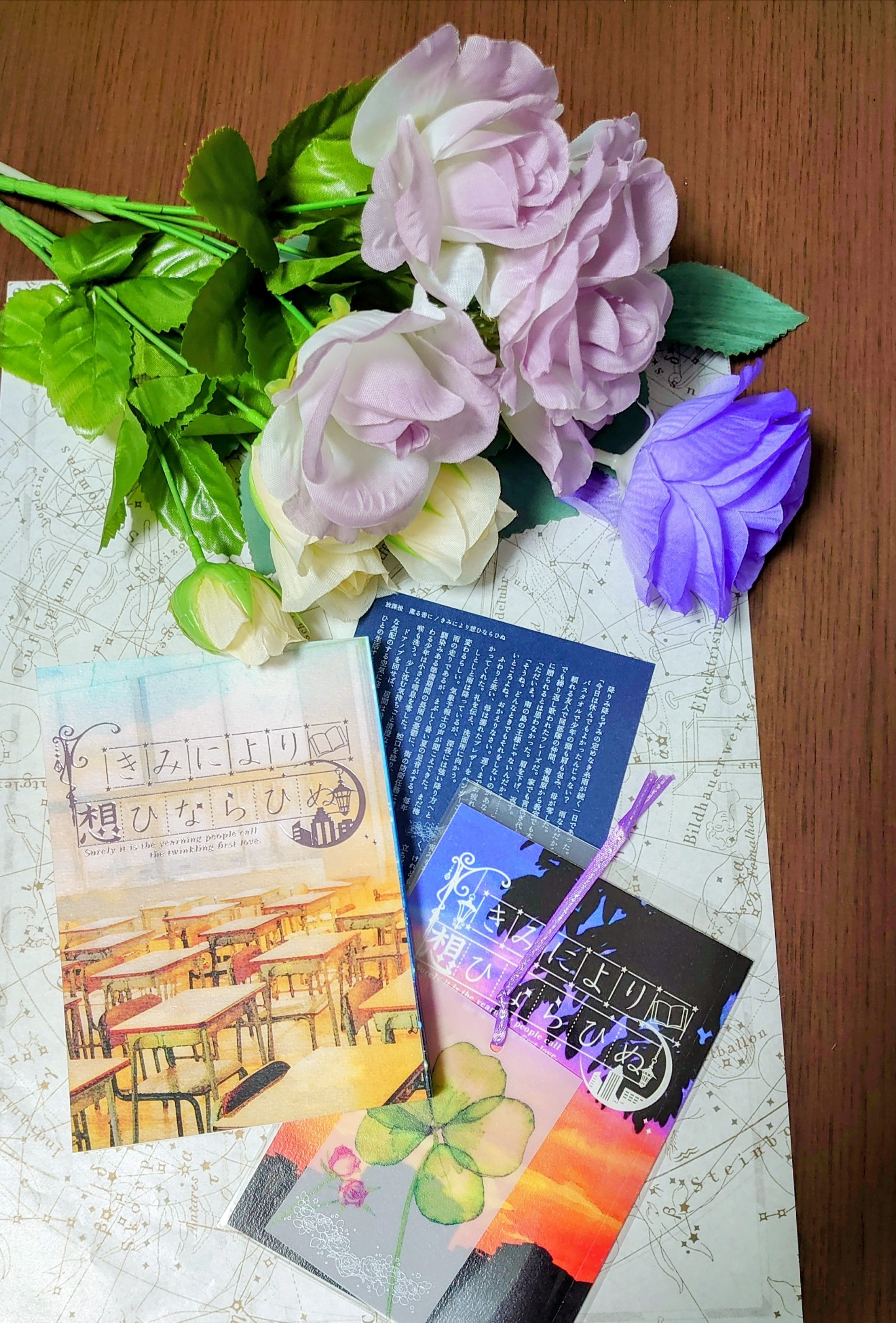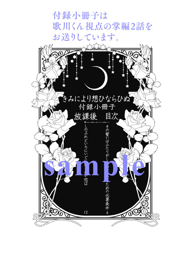 イベント直前の6月初めに完結する歌川くんに憧れ、紫のばらのひとになりたいと願うクラスメイト小説シリーズ『きみにより想ひならひぬ』を全話展示します。